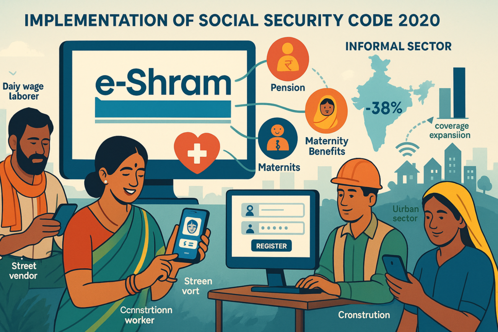 - Universal social security coverage: Code on Social Security 2020 consolidates 9 labour laws, extends coverage to gig workers, platform workers, and unorganised sector, with e-Shram portal registering 30.95 crore workers by July 2025