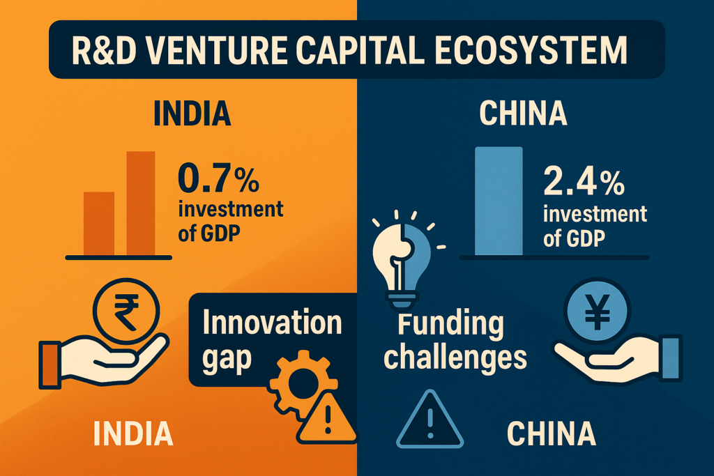 - R&D Investment Challenge: India’s 0.7% GDP on R&D versus China’s 2.4% highlights critical innovation funding gap, though venture capital inflows reached $25-30 billion in 2023 compared to China’s $70-75 billion