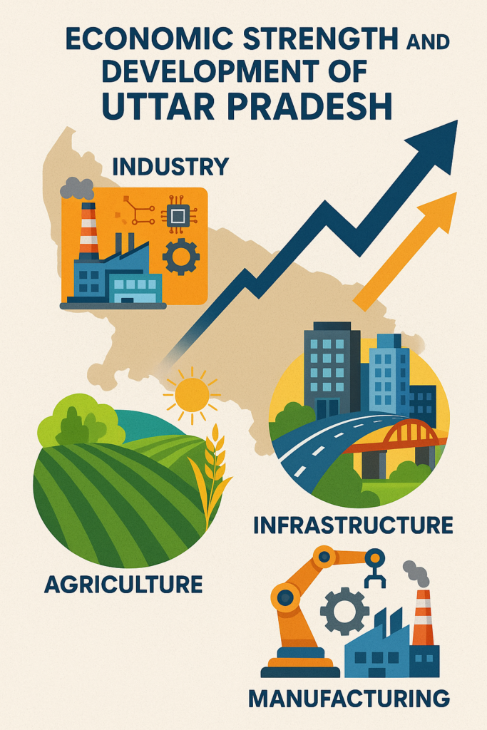 Arth Shakti (Economic Strength) forms the foundational pillar of UP’s development strategy, targeting unprecedented economic transformation across multiple sectors. The state’s economic trajectory shows remarkable momentum, with GSDP growing at 15.7% average from 2021-22 to 2023-24, recovering strongly from pandemic setbacks. phdcci