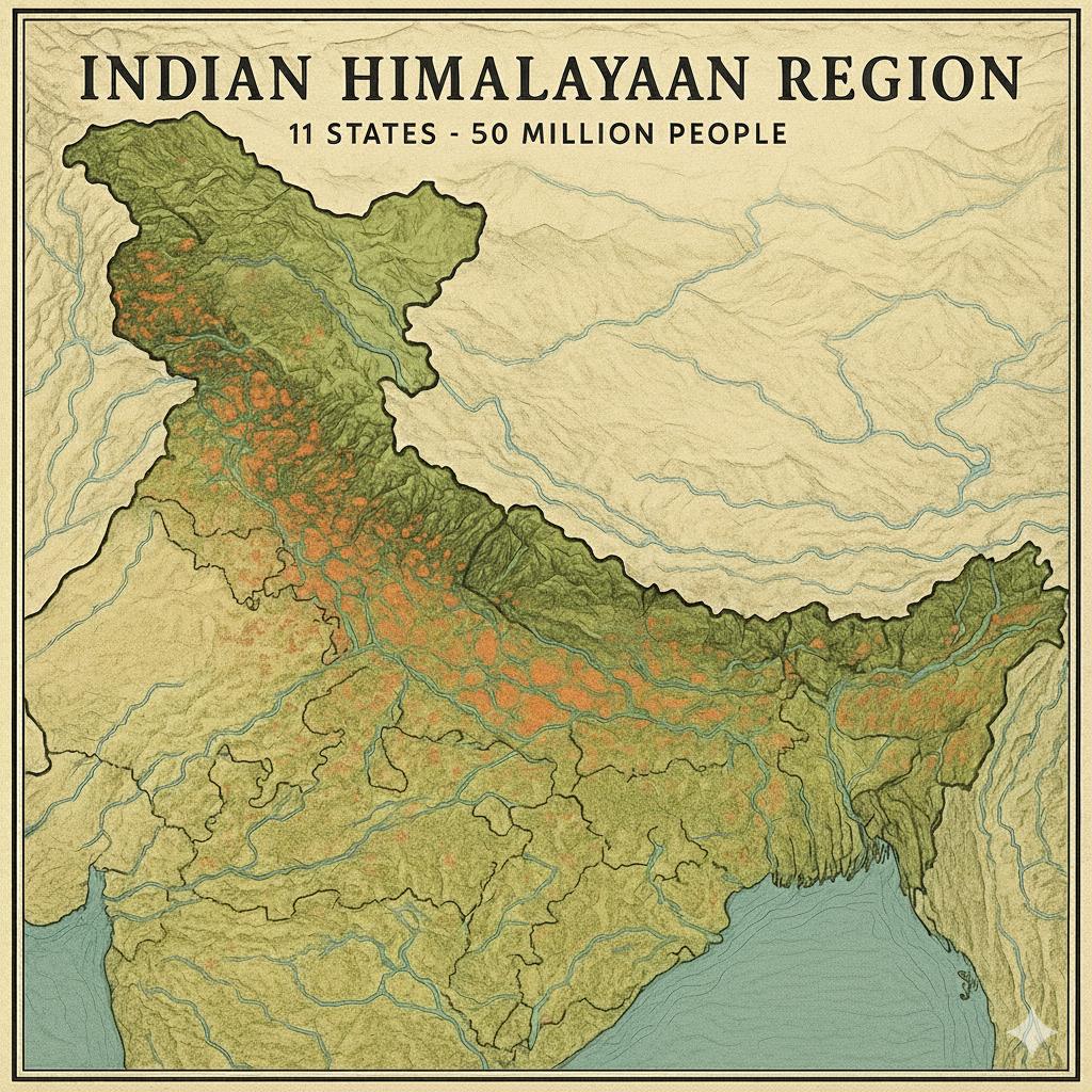 - Indian Himalayan Region spans 13 states/UTs housing 50 million people with over 40% urban growth (2011-21) creating unprecedented development pressure