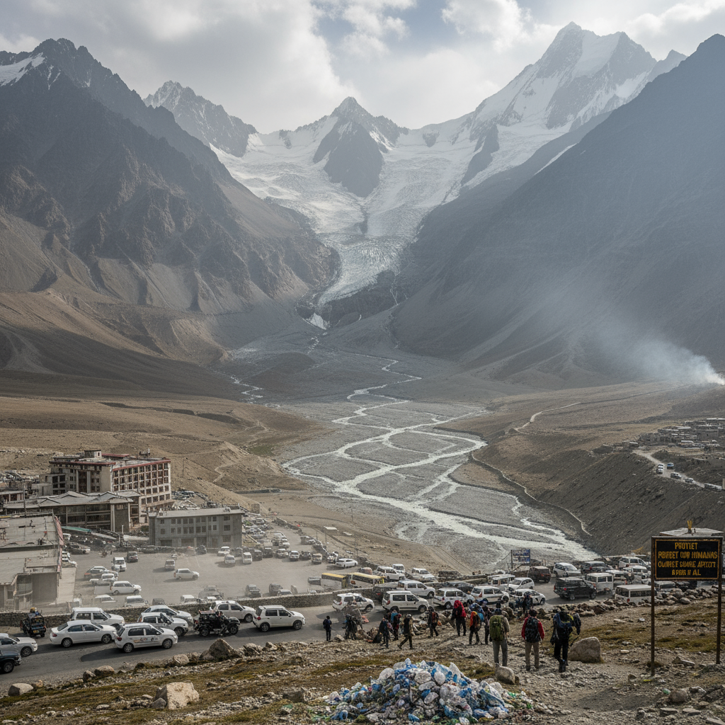 Ladakh faces a dual environmental crisis that compounds its socio-political challenges. Climate change impacts are starkly visible across the region’s fragile ecosystem.