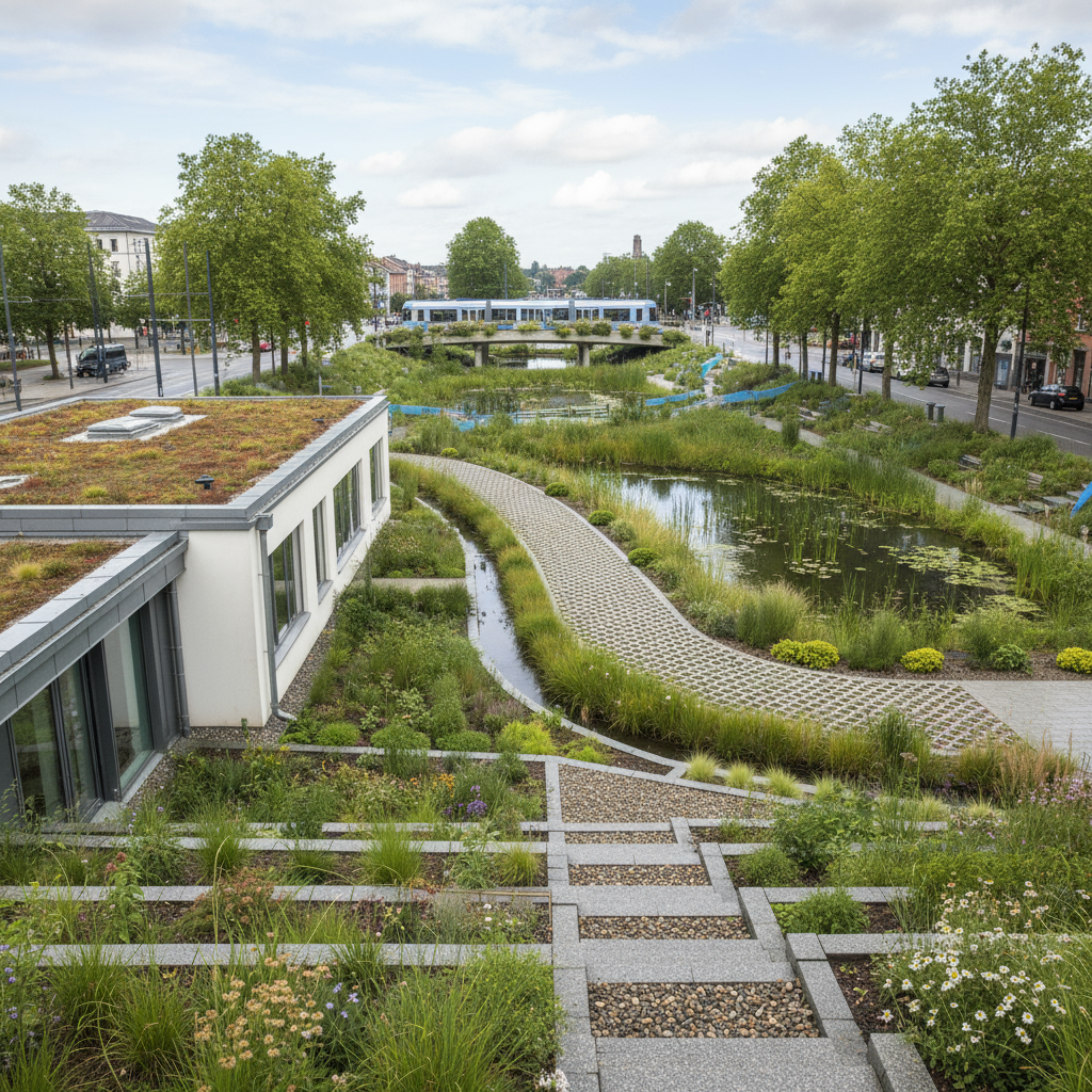 - Rain gardens and bioswales filtering runoff while providing urban greenery