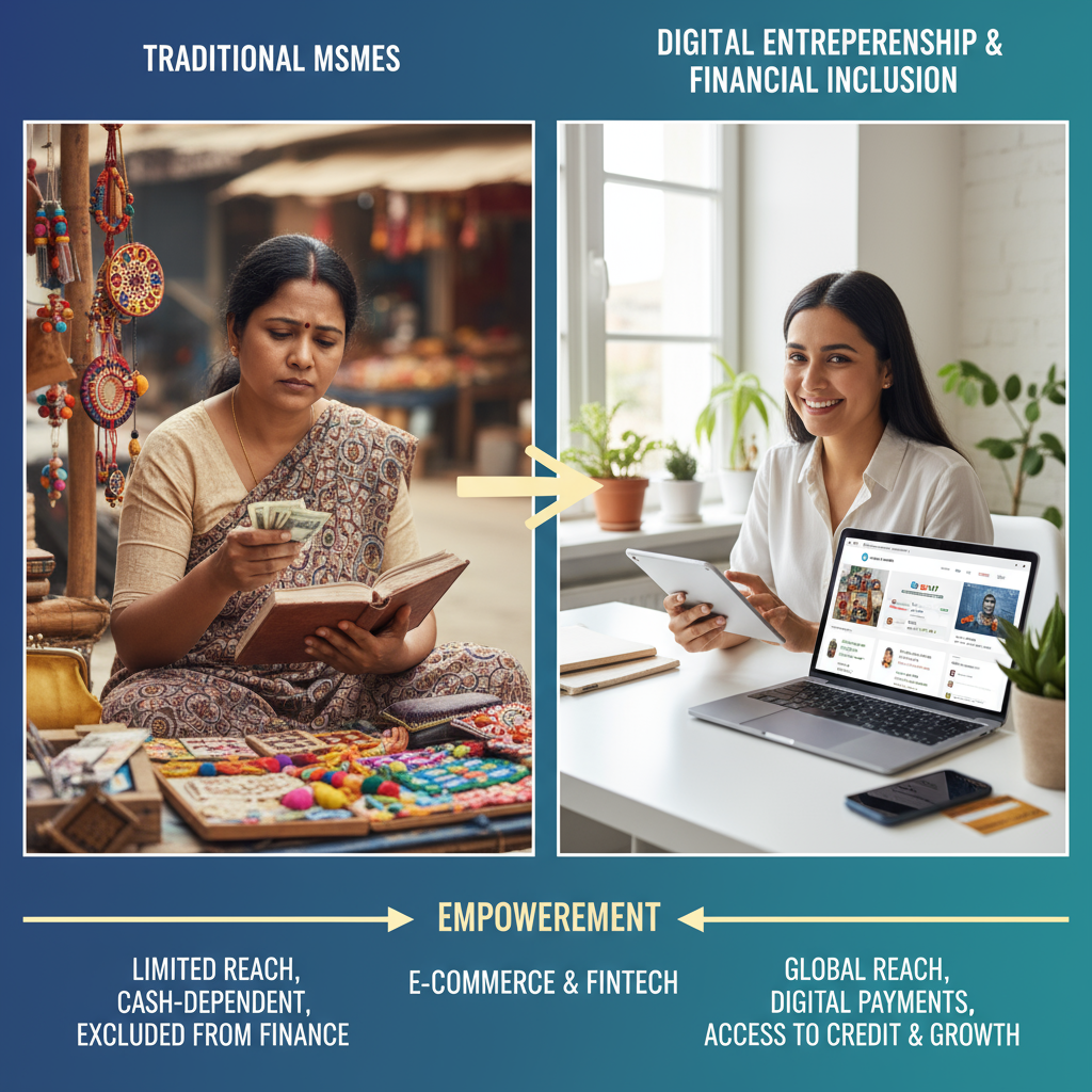 Targeted policies, funding, mentorship, and supportive networks for women entrepreneurs with integration of women-led MSMEs into formal economy through digital tools and e-commerce sector engagement facilitating women’s market access.