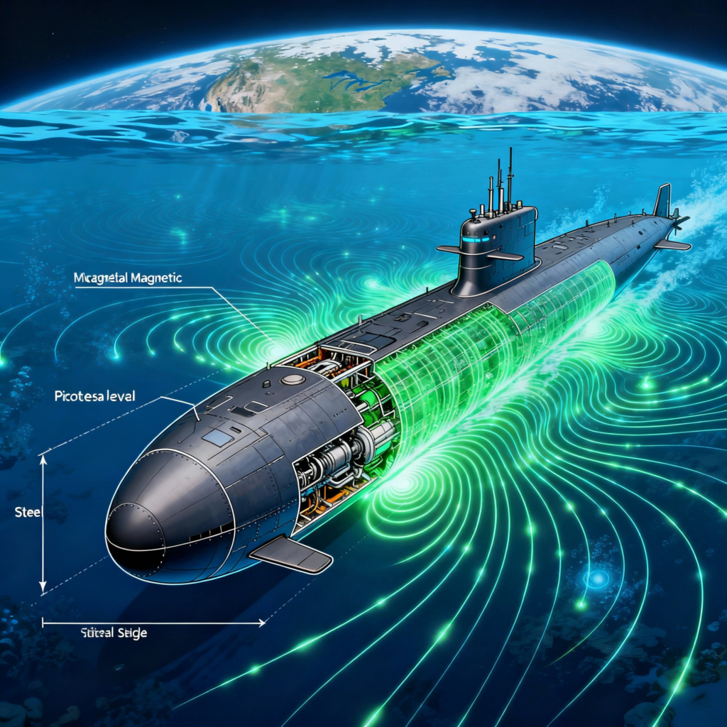 Now imagine an Indian P-8I Poseidon aircraft or UAV flying overhead, equipped not with conventional sonar but with quantum magnetometers—sensors so sensitive they detect the minute disturbances a submarine’s steel hull creates in Earth’s magnetic field. Disturbances measured in picoteslas (10⁻¹² Tesla)—changes a trillion times smaller than a refrigerator magnet’s pull. spslandforces
