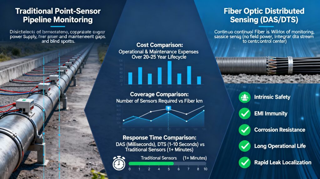 - Fiber Optic Sensing Advantages: Single fiber optic cables replace hundreds/thousands of point sensors, enabling continuous distributed monitoring over 30-80 km per interrogator unit, with zero blind spots, millisecond response time (DAS), and operational lifespan of 20-25 years—reducing long-term operational costs by 60-80% compared to traditional sensors.​