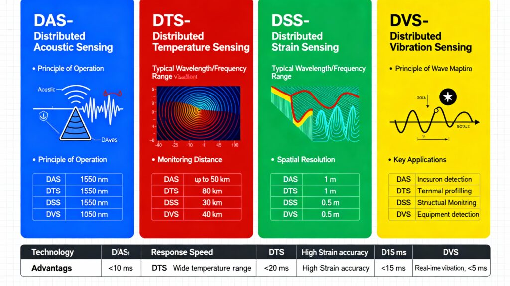 Distributed Vibration Sensing (DVS): Specialized variant optimizing Rayleigh scattering for vibration frequency analysis. Excels at identifying vibration patterns indicating rotating equipment faults or mechanical degradation. Used for condition-based maintenance of pumping stations and compressor units.​