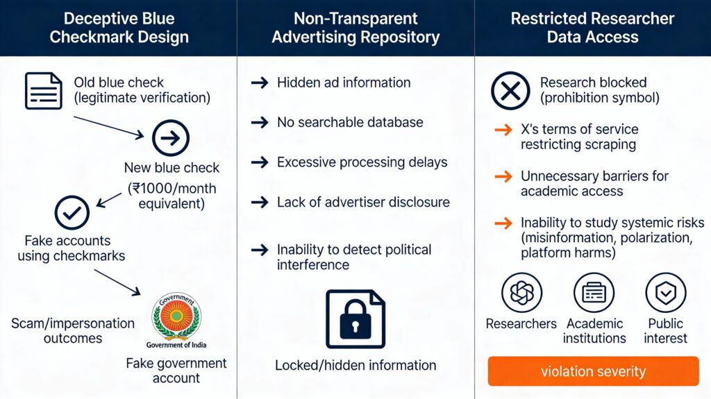 - Three Core Violations: (1) Deceptive blue checkmark design: Anyone can purchase verification without meaningful identity verification, deceiving users about account authenticity; (2) Non-transparent advertising repository: Hidden ad information, excessive processing delays, no searchable database preventing detection of political interference and manipulation; (3) Restricted researcher access: X blocks academic researchers from accessing public data needed to study systemic risks, misinformation, and platform harms.​