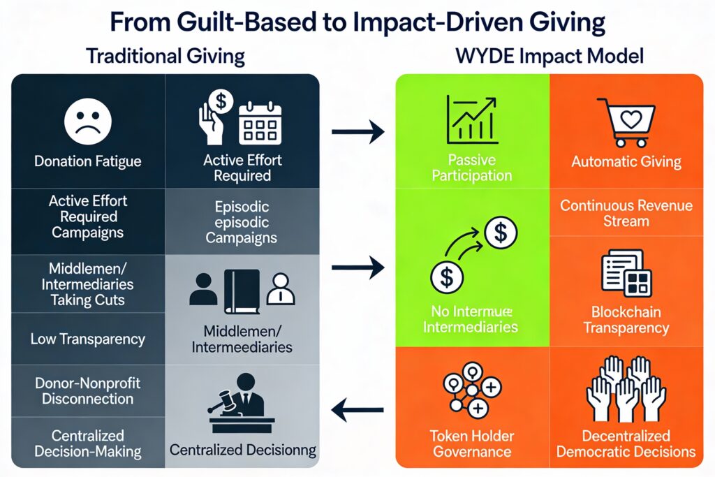 WYDE represents a genuine philanthropic innovation: automating charitable giving through market activity, enabling continuous funding, and democratizing governance through blockchain technology.